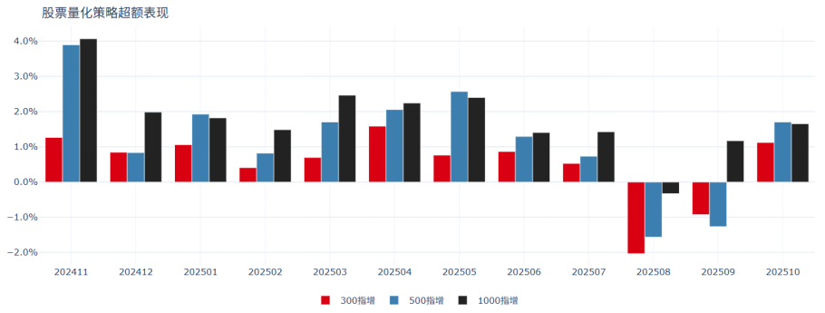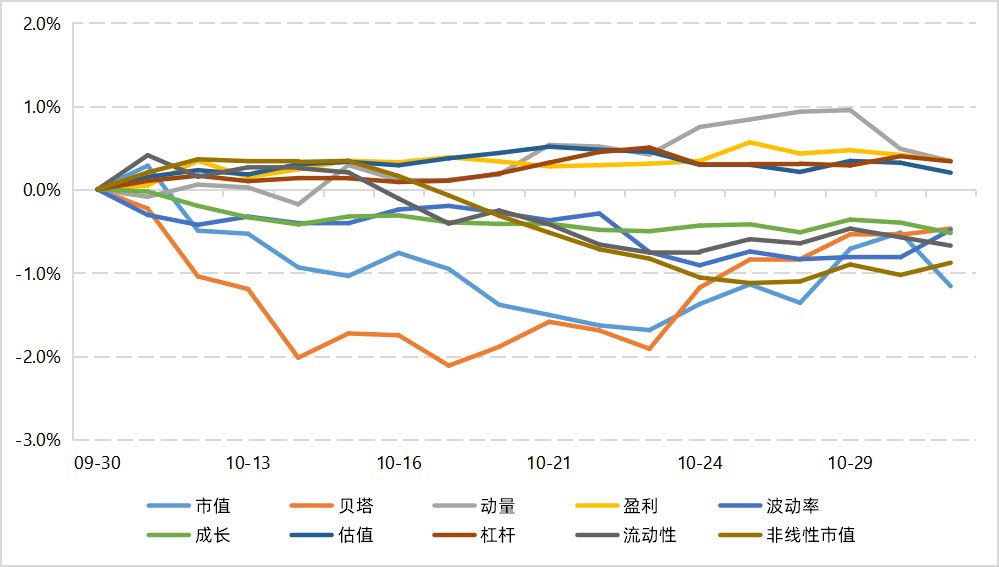 在8-9月的結(jié)構(gòu)化行情中,多個(gè)風(fēng)格短期都出現(xiàn)了逆轉(zhuǎn),而進(jìn)入10月后,隨著機(jī)構(gòu)抱團(tuán)的逐漸松散,量?jī)r(jià)風(fēng)格逐漸回歸。市值風(fēng)格單月下跌1.16%,代表市場(chǎng)小盤股更強(qiáng),市場(chǎng)中位數(shù)相對(duì)中大寬基指數(shù)的強(qiáng)弱出現(xiàn)回歸;動(dòng)量風(fēng)格上漲0.34%,波動(dòng)率、流動(dòng)性風(fēng)格分別下跌0.48%、0.67%,均回到長(zhǎng)期方向上,低波低流動(dòng)性效應(yīng)凸顯;基本面風(fēng)格上,盈利、杠桿、估值等基本面風(fēng)格收益都為正,且估值強(qiáng)于成長(zhǎng),當(dāng)前市場(chǎng)的微觀結(jié)構(gòu)和歷史統(tǒng)計(jì)規(guī)律相符,量化策略的預(yù)測(cè)準(zhǔn)確度較高,疊加風(fēng)格暴露帶來(lái)的收益為正,量化策略的超額在10月迎來(lái)修復(fù)。