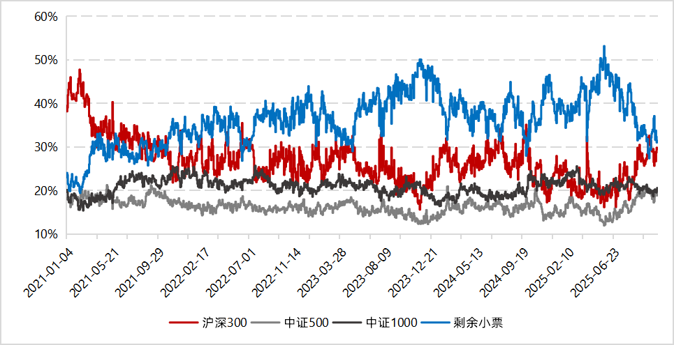 10月,市場(chǎng)活躍資金仍大部分集中于大盤成長(zhǎng)中,滬深300的成交占比一度突破30%,月末也仍然保持在29%以上,AI、半導(dǎo)體、固態(tài)電池等主題下的權(quán)重股仍然是大資金競(jìng)相追逐的對(duì)象,即使在下半月科技出現(xiàn)回調(diào)后,市場(chǎng)雖然出現(xiàn)縮量,但小票的成交占比仍未有明顯起色,當(dāng)前市場(chǎng)處于極致抱團(tuán)向均衡演變的階段,市場(chǎng)流動(dòng)性分布仍非常態(tài),中小票的流動(dòng)性占比仍有相當(dāng)?shù)男迯?fù)空間。