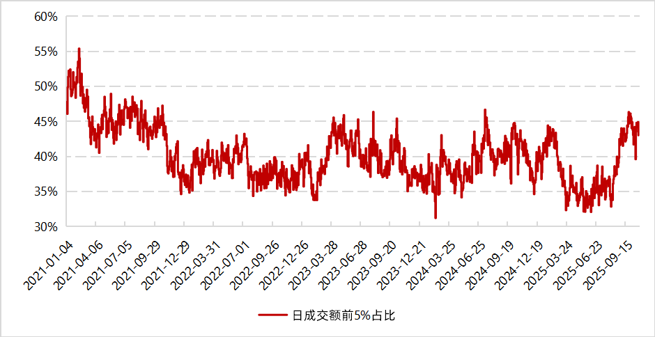 在8、9月的抱團(tuán)行情下,A股日成交額前5%的個(gè)股的成交占比總和一度超過(guò)45%,逼近2021年初“茅指數(shù)”抱團(tuán)的水平,進(jìn)入10月,隨著貿(mào)易爭(zhēng)端的反復(fù)已經(jīng)海外科技巨頭的業(yè)績(jī)影響,抱團(tuán)出現(xiàn)了一定的瓦解,抱團(tuán)股的部分資金開(kāi)始切換其他低位板塊,市場(chǎng)流動(dòng)性集中度下降,量化策略的選股環(huán)境改善。