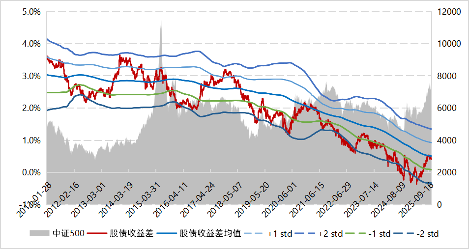 3. 股債收益差:中證500指數(shù)位于中等配置性價(jià)比區(qū)間
