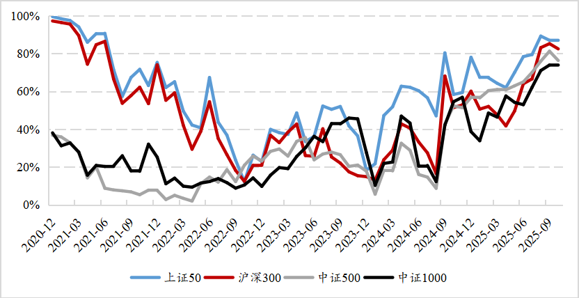 寬基指數(shù)在10月震蕩,而盈利端未有明顯起色,因此指數(shù)估值均處于歷史高位,截至10月末,滬深300估值處于過(guò)往10年的83%分位;中證500估值處于過(guò)往10年的76%分位;中證1000估值處于過(guò)往10年的74%分位,中證500和1000的估值分位達(dá)到近5年最高值,存量資金博弈市場(chǎng)下,指數(shù)上行的空間相對(duì)有限,市場(chǎng)價(jià)格先于盈利端反應(yīng),在實(shí)際的盈利數(shù)據(jù)好轉(zhuǎn)之前,指數(shù)估值向上的空間相對(duì)有限。